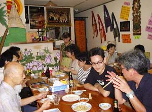 ●今回は桜美林のビルマ語講座の浅野先生が呼びかけられ、そのクラス仲間6人と岡さん(ビルマの戦没者のために仏像を彫っておられる)の総勢8人が小田急線伊勢原駅に集合、全員が初めてというこの店に向かいました。思いの外おしゃれな店の雰囲気に私もウキウキ気分で席についた、その直後、上條さんから「ウ・モスが今回の取材をよろしくとのことです」と言い渡されたのです。「えー?今回はただ食べて楽しむつもりだったのに〜〜」なんて泣いたところで後の祭(?)。で、久しぶりの取材に初めは緊張していたのですが、料理の美味しさについ気が緩んだこともあってか、質問するのを忘れたことが数件……これが本当の、後の祭(泣)。まぁそれはともかく、ティン・テッさんと奥様の、お客さんに対するせいいっぱいの歓迎ぶりが新鮮に映りましたし、また行ってみたいなと思わせる店でもありました。お二方にはお忙しい中、質問にも快く応じていただき有難うございました。 ●在日ミャンマー人が多く住む都内でも、なかなか経営が難しいミャンマー料理店が伊勢原にあるということで行ってきました。こんな田舎で(伊勢原の人すみません)マイナーなミャンマー料理店をはたしてやっていけるのだろうか? きっとはやりのエスニック料理と銘打っていろんな国の料理を出しているのだろうと想像しながら入ってメニューを見てみるとなんとミャンマー料理一色。ここはまぎれもない本格的ミャンマー家庭料理専門店でした。といって、客層は圧倒的に日本人が多いようで入りやすく、メニューも日本人に解りやすい料理名が付けてありました。そんな工夫もあってか私たちの食事中ずっと店内はいっぱいでとても繁盛していました。料理はもちろんモヒンガーや煮込みカレーといったオーソドックスなミャンマー料理から、この店でしか食べられないオリジナル料理までけっこう豊富で、とくにラペッを混ぜた「ユザナチャーハン」は参加者全員これはいける!とうなっていました。都内からはちょっと遠いけれど、一度食してみる価値ありです。これからも新たな創作料理に挑戦していきたいとのこと。今度訪れるときはどんな料理が加わっているか楽しみです。