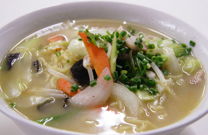 今回の取材には子供たちの同行があった。しかし、子供には辛い料理が続いたので、料理は子供た ちの目の前を通りすぎていくばかりであった。可哀想である。子供たちは、フン、と横をむいてし まい、紙飛行機をつくって、大人たちの顔にぶつけはじめた。そうやって、憂さをはらしているの だろう。母親は、まったく、と溜息をつき、すっく、と立ち、厨房にはいり、何か辛くない料理は ないかと所望した。それで出てきたのが、この麺料理である。これは五目タンメンであった。日本 の中華食堂で出てくるのと味も具の載せかたも、まったく同じである。スープがより濃くて白濁し ている感じはあったが、ま、ほとんど同じである。いつもは、辛味が加わっているのかもしれない が、そこは確認していない。ともあれ、やっときた辛くない料理、さあ食べなさい、とお母さんは すすめたが、子供たちは、チラリと冷たい視線を投げるばかりで、料理には手をつけない。紙飛行 機遊びを続けている。次々と大人たちに飛行機をぶつけるのであった。最初の反抗期かもしれない 。