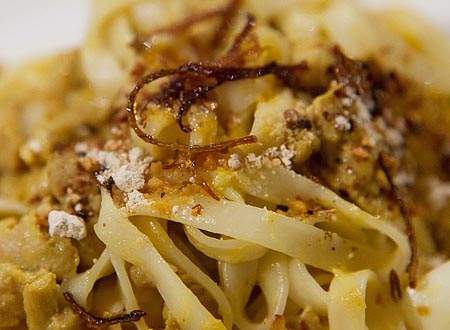 ナンジートウ見た感じ、パスタ料理のカルボナーラに似ている。ポリューム感がある。食べると、ムニュとしていて歯ごたえがあり、そこもカルボナーラに似ている。しかし味は、奥深い。口にミャンマーの密林の涼風が吹き渡る感じがある。スーッ、と何かが通り過ぎる。エキゾチックな顔立ちのお店のママさんに作り方を聞いた。鶏肉を大蒜(にんにく)と生姜(しょうが)で炒め、ココナツミルクを加える。そこに平麺を投じ、あえる。仕上げに豆乳とナンプラーで味を調える。これで完成。わりと簡単。この作り方もどこかパスタ料理に似ている。これはマンダレーの料理で、主食としても副食としてもよく食べられているとのこと。またお祝い事があったときなどに、お坊さんに食べていただくものらしい。この料理の肝(きも)はココナツミルクにあるように私には思えた。全体をマイルドな味にしている。奥床しくしている。それはミャンマー人の人柄に一致してくる。味は人、人は味、なのであった。