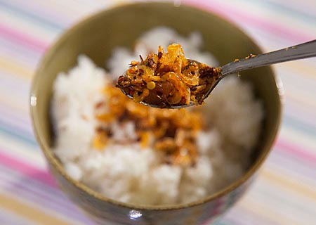 番外編ミャンマーふりかけテーブルソルトならぬ、MAY2名物のテーブルふりかけ。これだけでご飯が何杯でも食べられる。無料です。